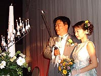 デザートはヨーグルト風ババロア風プリン風、う〜ん酔っててよう覚えとらん。 最後のお色直しを終え、キャンドルサービスは時間の都合かメインのキャンドルのみでした。 |