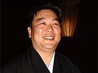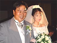 受付を済ませると、ひと、ヒト、人のフロアを抜けてジャングル温泉のようなレストランで軽く前祝い。 稲葉君が3杯目の水割りを飲み干した頃、式場前では新郎がその胸の内を表したような笑顔でお出迎えの準備をしていました。 |