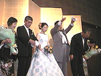 御両親への花束贈呈、ご両家挨拶のあと 万歳三唱となりました。 新郎も御義父さんも余程嬉しかったのか、 いっしょに万歳を揚げていました。 |