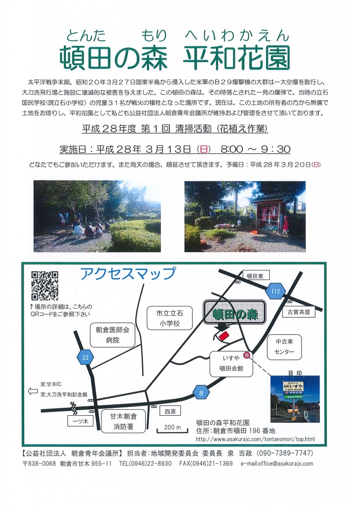 地域開発委員会第1回事業が3月13日(日)に開催されます。太平洋戦争末期、昭和20年3月27日国東半島から侵入した米軍のB29爆撃機の大群は一大空爆を敢行し、大刀洗飛行場と施設に壊滅的な被害を与えました。この頓田の森は、その時落とされた一発の爆弾で、当時の立石国民学校(現立石小学校)の児童31名が戦火の犠牲となった場所です。現在は、この土地の所有者の方から無償で土地をお借りし、平和花園として私ども公益社団法人朝倉青年会議所が維持および管理をさせて頂いております。午前8:00より1時間30分の清掃作業になります。是非多くの皆様の参加をお願いいたします。